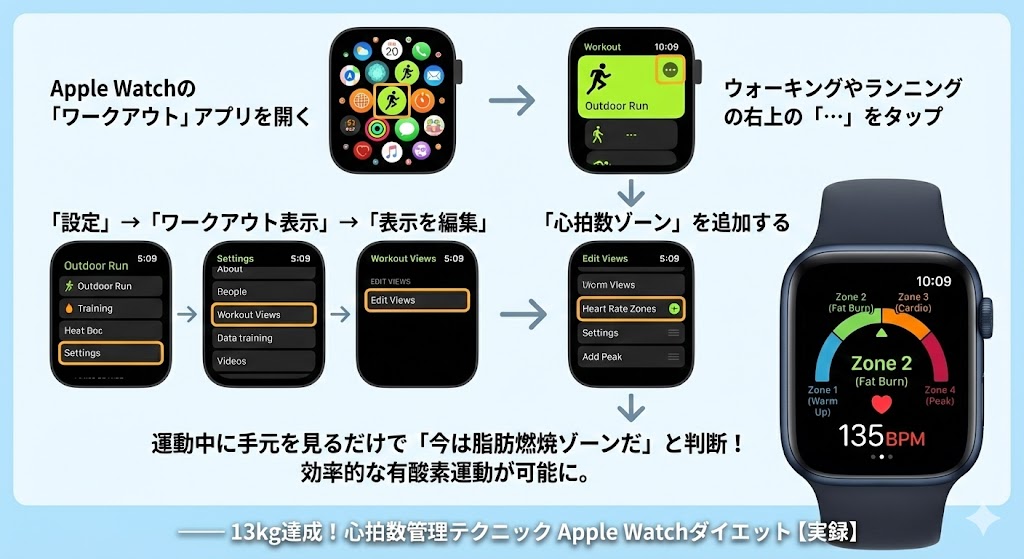 これで、運動中に手元を見るだけで「今は脂肪燃焼ゾーンだ」「少しペースを落としてゾーンを維持しよう」と判断でき、効率的な有酸素運動が可能になります。